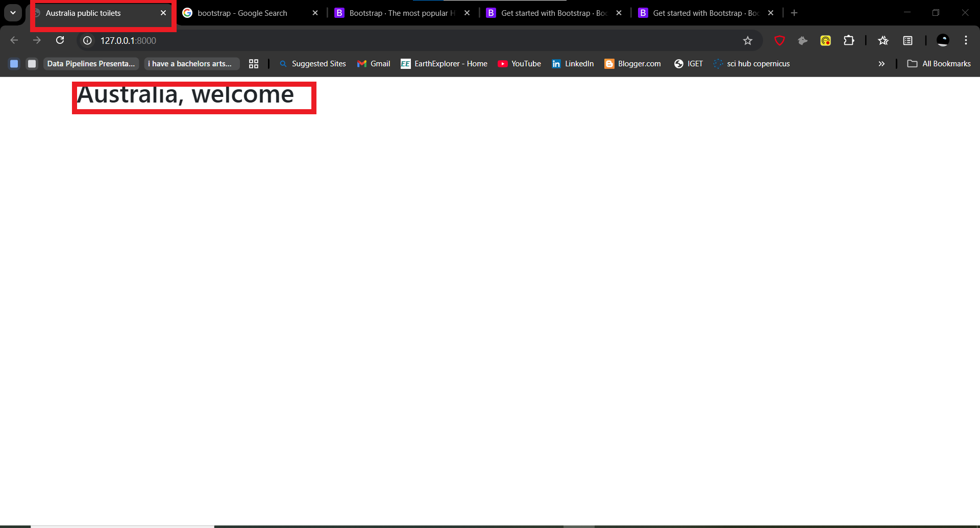 Here, you have the Australia, welcome message that you defined in home.html as well as the Australia public toilets title that you set in base.html. That means that the template inheritance works!